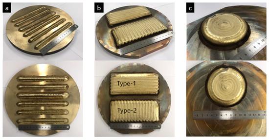 Figure 3 shows the NAB material deposited using WAAM. In all the experiments, the cast NAB was used as a substrate. In Figure 3a, a single bead of about 160 mm was deposited on a round substrate. A total of six conditions were used, and each single bead was tested when the substrate temperature was 26~27 to prevent the base material from preheating. Figure 3b shows a block-type NAB alloy of 150 mm (L) × 60 mm (W) × 25 nm (H) after deposition. The two blocks of the same size have different stacking paths. Welding or deposition by melting a metal causes anisotropy of the metal. When a molten metal is solidified, strong dendrites are formed around a small nucleus, which leads to metal anisotropy [29]. The dendrite direction is determined by the welding direction [30]. Wang modeled the laser heat source and studied the orientation of dendrite around the moving heat source, and Wei [31] reported that in the lamination process using arc welding, the dendrite is determined by the lamination direction. In Figure 3b, type 1 and 2 are deposited in different welding directions; that is, the dendrite direction is different. Figure 3c is a test specimen made by applying a circular deposition path to fabricate a standardized wear test specimen.