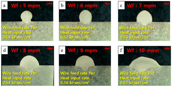 Figure 4 shows the cross-section of a single bead deposited by WAAM for six different wire feed rates. As shown in Figure 4, the bead shape varies depending on wire feeding speed. In Figure 4a,c,d, the wire feed rate per heat input is the same as 0.54 kJ·s/cm2, but the bead shape is different. In Figure 4f, the wire feed rate per heat input rate is larger than the average wire feed rate per heat input rate of 5.6 kJ·s/cm2 by 0.51 kJ·s/cm2. An excessive heat input weakens the surface tension of a bead, and this weakened surface tension causes a non-uniform bead shape.