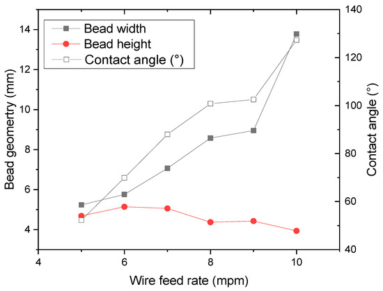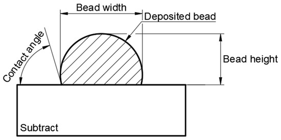 To analyze the effect of conditions on the shape of a single bead, bead width (mm), bead height (mm), and contact angle (°) were measured, as shown in Figure 5. Bead width and bead height are very critical factors in metal deposition, and are both related to deposition efficiency. The width is a reference factor in determining the overlap amount of each bead during continuous deposition. The bead height is a factor that determines the number of layers when making a part using WAAM.