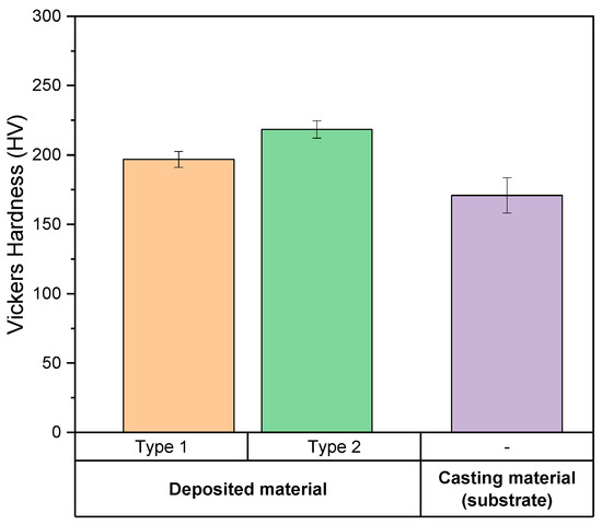 Figure 10 compares the hardness of the deposited NAB material according to stacking direction and the hardness of the casting material. Regarding the hardness test results, type 2 (longitudinal) showed higher numbers, such as the tensile strength test. The average hardness of type 1 (transverse) was 196.8 HV and the average hardness of type 2 (longitudinal) was 218.4 HV. The average hardness of the casting material (substrate) was 170.8 HV. The hardness of type 2 (longitudinal) was improved by 10% compared to type 1 (transverse), and was about 28% improved compared to the casting material (substrate).