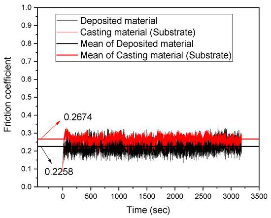 Comparison of the friction coefficient in the WAAM-fabricated NAB and the cast NAB (substrate).