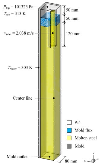 - Yang, J.; Cai, Z.; Zhu, M. Transient thermo-fluid and solidification behaviors in continuous casting mold: Evolution phenomena. ISIJ Int. 2018, 58, 299–308. [Google Scholar] [CrossRef]