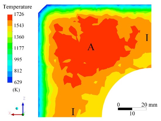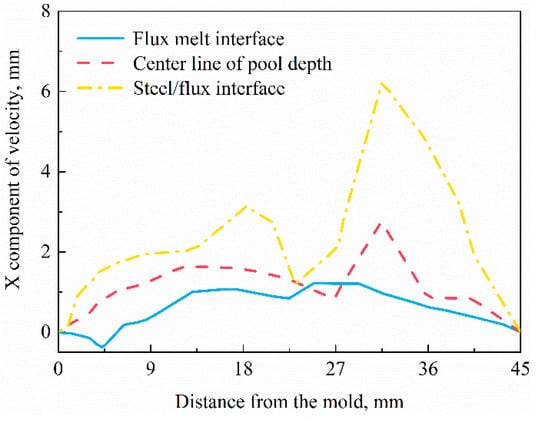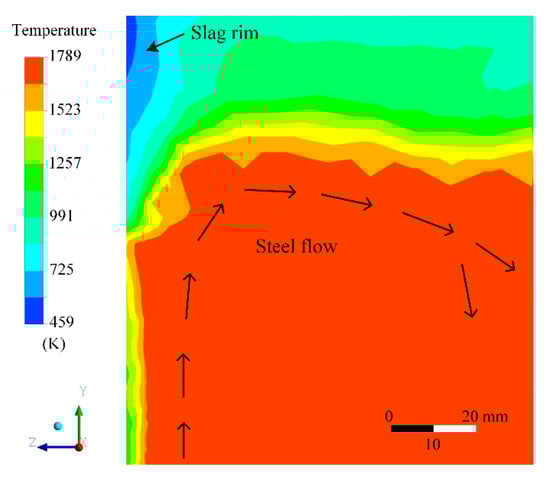 - An active region with higher temperature and thicker layer is generated near the mold corner in the liquid flux pool, corresponding to the impact position of the steel flow on the surface. In contrast, the flux temperature between the middle of the mold wall and the nozzle is lower due to the reduced convective heat transfer of molten steel and closer cooling distance from both sides.