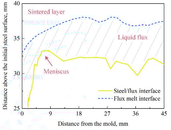 - Meng, Y.; Thomas, B.G. Simulation of microstructure and behavior of interfacial mold slag layers in continuous casting of steel. ISIJ Int. 2006, 46, 660–669. [Google Scholar] [CrossRef]