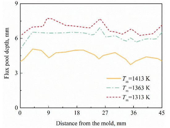 - Lower melting temperature of mold flux produces deeper liquid pool, which is expect to contribute to the consumption flow, especially the feeding to the middle of the mold wall. The decreases of melting temperature and viscosity permit larger velocity that generates more convective heat transfer from the steel/flux interface to the active region of the liquid pool.