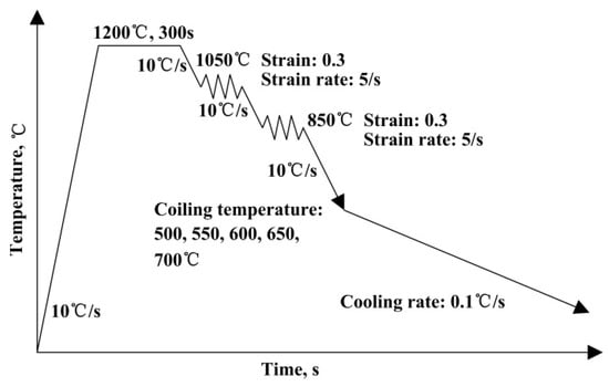 Thermal simulation experiments were conducted on a Gleeble 3800 thermal simulation machine (DSI, Poestenkill, NY, USA). As shown in Figure 1, the specimens were heated to 1200 °C with a heating rate of 10 °C/s and held for 300 s to homogenize the micro-alloyed elements and dissolve carbonitrides. The specimens were then cooled with a cooling rate of 10 °C/s to1050 and 850 °C to be deformed by 0.3 with a strain rate of 5/s. After deformation, specimens were cooled to 700, 650, 600, 550 and 500 °C with a cooling rate of 10 °C/s and then cooled to room temperature at a cooling rate of 0.1 °C/s to simulate the coiling process.
