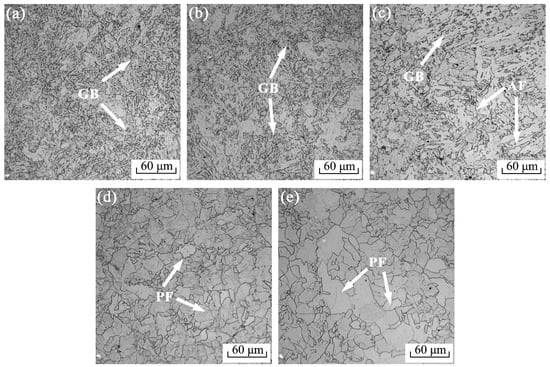 Optical microstructures of tested steel at different coiling temperatures. (a) 500 °C; (b) 550 °C; (c) 600 °C; (d) 650 °C; (e) 700 °C.