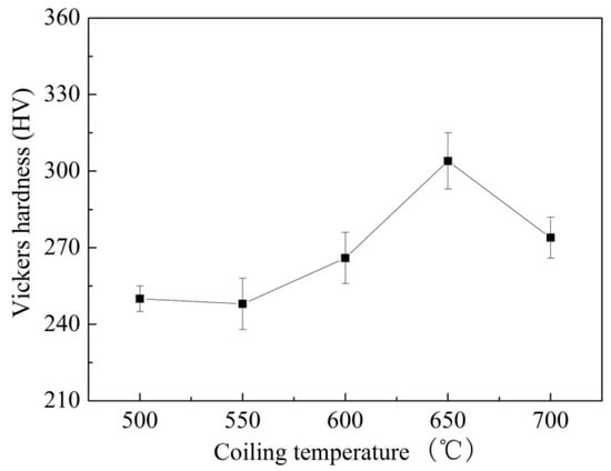Vickers hardness of the tested steel at different coiling temperatures.