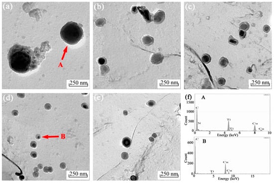 TEM morphologies of precipitates at different coiling temperatures. (a) 500 °C; (b) 550 °C; (c) 600 °C; (d) 650 °C; (e) 700 °C; (f) EDS patterns of different precipitated particles indicated as the red label “A” in (a) and “B” in (d).