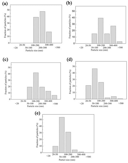 Frequency distribution of precipitates at different coiling temperatures. (a) 500 °C; (b) 550 °C; (c) 600 °C; (d) 650 °C; (e) 700 °C.