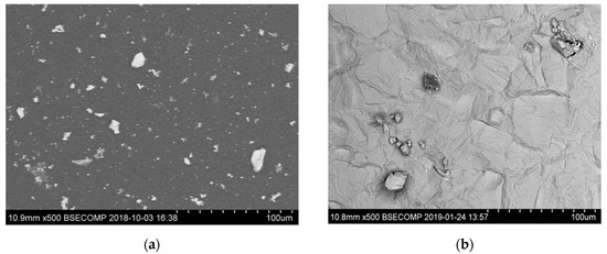 Characteristics of non-metallic inclusions (such as composition, morphology, size, number and location) were analyzed by means of scanning electron microscopy (SEM) (Hitachi, Tokio, Japan) equipped with energy dispersive spectroscopy (EDS). The inclusions were investigated on the surface of film filters (FF) as well on the surface of metal samples (MS) that had been subjected to dissolution. Some SEM images of typical inclusions investigated on a film filter and metal surface after EE are shown in Figure 1.