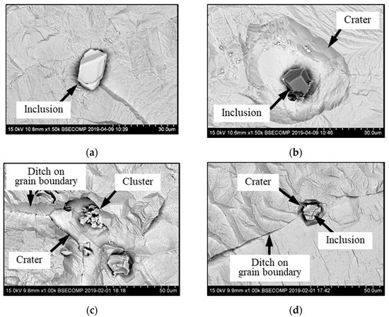 It was detected that the matrix was not evenly dissolved during the electrolytic extraction process around different inclusions. As can be seen in Figure 3, the dissolution of the matrix around some inclusions was almost uniform (Figure 3a) as in most areas of a metal sample, whereas large size “craters” of metal dissolution were observed around other inclusions and clusters (Figure 3b). Moreover, significant metal dissolutions present as “ditches” were observed on grain boundaries of the EP718 sample. These craters and ditches formed around some inclusions and on grain boundaries can be explained by the easier electro-chemical dissolution of the weakened matrix around these corrosion-active inclusions and on grain boundaries during electrolytic extraction. However, according to publications of Inoue et al. [32], the 10% AA electrolyte used in this study for electrolytic extraction does not dissolve the inclusions observed in these alloy samples. In other words, these inclusions are not directly involved in the dissolution process of the matrix around these inclusions due to some additional electro-chemical reactions. As a result, it can allow us to assess the corrosion resistance of the matrix around different inclusions and to detect the inclusions having the most harmful effects on weakening of the matrix around these inclusions.