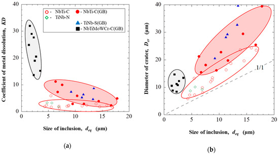 In order to clarify the degree of influence of various inclusions on the corrosion resistance, the dissolution of the matrix near the inclusions on the surface of the metal samples was analyzed after electrolytic extraction. The extent of the matrix dissolution around various inclusions after electrolytic extraction was estimated and compared by determining the diameter of the dissolution crater around inclusions (Dcr, Equation (1)) as well as the relative coefficient of metal dissolution (KD, Equation (2)). A comparison of some characteristics of different inclusions, size ranges of craters (Dcr) and average KD values (including value of standard deviation) in investigated alloy samples are given in Table 4.