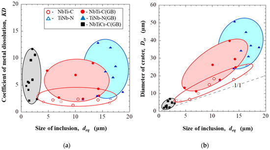 As can be seen in Table 4 and Figure 5, the largest craters in the alloy 718 sample were observed around TiNb-N (Dcr = 24–51 μm) and NbTi-C (Dcr = 16–40 µm) inclusions located at the grain boundaries. The size of craters around these types of inclusions tends to increase significantly with an increased equivalent size (Deq) of inclusions. Though the KD coefficient for these inclusions vary in a wide range (from 2 up to 13), the dissolution coefficient of the matrix around these inclusions located on grain boundaries is on average 2.5 times larger compared to inclusions located inside of grains.