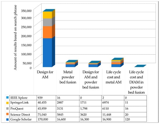 A summary of the review scope used in this study (shown in Figure 2) determined that the highest number of published articles are addressing the topic “design for additive manufacturing”, followed by “LCC in metal additive manufacturing”, “metal powder bed fusion”, “design for powder bed fusion”, and “Life cycle cost and simulation driven DfAM in powder bed fusion”. Several of the results were only vaguely related to L-PBF, rather discussing AM methods in general. Concerning LCC, it becomes evident that the topic has gained measurable attention in the manufacturing sector, nevertheless the number of publications addressing metal AM is limited. Several studies considered LCC as part of sustainability or life cycle assessment studies. The majority of the literature involves non-metal materials and AM methods in general. The web search of LCC in PBF or L-PBF costs gave only 167 results from all three databases used, without any findings on the IEEEXplore platform.