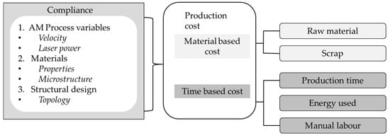 The cost optimization based on process, material, and design structure for metal based AM has also been studied []. The review done in study [] focused on the crucial aspects (part design and process parameters) concerning controlling the build time and cost. The benefits with the proposed methodology produced a 21% improvement in build time and a 15% reduction of total estimated production cost compared to addressing these themes separately. Processing factors such as beam velocity, laser power, and part optimization effectively influenced energy, material, and time usage. The result of the study showed the importance of integrating process design with topology design to economic efficacy in AM. A summary of the process variables, material properties, and structural design were defined based on the design compliance for cost minimization as Figure 4 shows [].