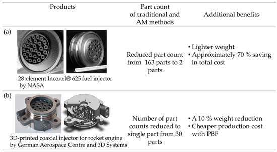 Example of metal aerospace designed liquid fuel injectors (a) by NASA, reproduced from [,] and (b) three-dimensional (3D) systems reproduced from [] with permission from 3D systems.