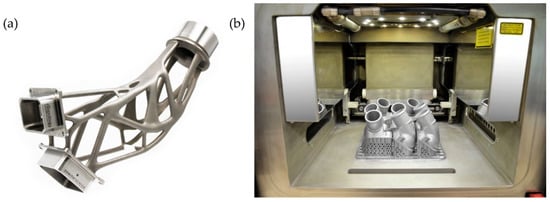 Representation of optimized (a) titanium spacecraft bracket, reproduced from [] with permission from nTolology and (b) aluminum/silicon printed thermostat covers attached to the build platform. Reproduced from [] with permission from Daimler AG.