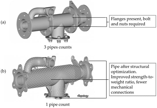 Case studies including. (a) classical assembly of pipes and (b) redesigned pipe assembly as consolidated a pipe assembly with conformal ribbing. Reproduced from [] with permission from nTolology.