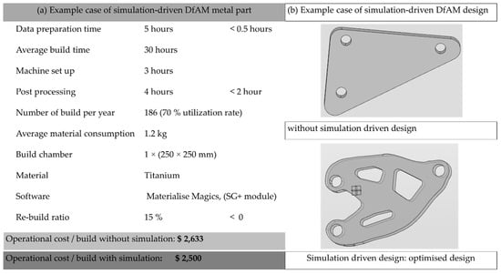 Additive manufacturing (AM), known also as 3D printing, is “a process of joining materials to produce parts based on three-dimensional (3D) modelling, usually layer upon layer, as opposed to subtractive manufacturing and formative manufacturing methodologies” []. Aerospace, medical, automotive, and service bureaus are key sectors where AM continues to evolve with automotive leading in developments towards full-scale production of AM for benefits such as improved strength and weight functionality [,,,]. There has not been much precedence in assisting companies in integrating L-PBF to business portfolio, except for a few published studies concerning computer simulation software such as Autodesk, nTopology, SolidWorks, CATIA, E-Stage, and Magics [,,,]. The scarcity of available literature on the cost-efficiency and lacking reports from industrial scientific sectors currently limit AM industrial full implementation [,,] as published data are often highly case-specific. These challenges are possible to overcome once the key players involved in this modern technological milestone unveil the formation of costs and elaborate the scientific knowhow [,]. This paper aims to show how simulation driven design for additive manufacturing (simulation driven DfAM) rules may be utilized with attention to the effect on part quality and accompanying life cycle cost (LCC) to offer better understanding and aid in its adoption. The optimization possibilities for improved profitability and new research areas also are discussed. No study to our knowledge has considered an integrated study of simulation driven DfAM and LCC for cost efficiency.