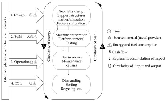 As it can be seen from Figure 10, design and manufacturing phases are interrelated to the remaining phases of the product life cycle. The literature review established that controlling parameters during the lifespan of components are largely dependent on time, energy, and raw material consumption. These parameters can be controlled during the design phase as denoted by the symbols in Figure 10. The utilisation of simulation software to design optimized components can reduce the rate of failure occurrences. While the physical controlling of material, time, and energy usage is realised during the manufacture phase, they are set already during the design phase. Creating optimised designs and proper support structures can prevent build failures such as distortion and lack of fusion voids. As it can be observed from Figure 10, the consumption of fuel and energy can be controlled during the use phase. The possibility to make effective or efficient design suitable for a specific application can reduce the consumption of these utilities. Lifetime of components is also increased when optimized parts are made. This corresponds to the increased service time for components. The use of L-PBF reduces also downtime in the operational phase with an on-demand and on-time manufacturing option. During EOL, time and energy usage can be reduced if the designing phase was planned to consider the ease of disassembly and related EOL actions. The circularity connecting the different phases denotes that cash continues to flow within the whole system. The design phase allocates for approximately 20% of overall product cost, while around 75% of the manufacturing costs are fixed (e.g., cost of equipment and raw materials). The observed change is obvious when compared to the last decade, when the design cost was making up only 5% of the overall product cost [].