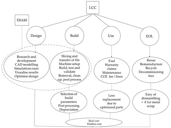 This study considers the impact of simulation driven DfAM on the LCC of L-PBF manufactured products. The motivation of this study is to provide a deeper understanding of the costs structure of metal L-PBF products and offer recommendations to support the decision-making towards the acceptance of the process. The potential of PBF has been broadly discussed in the studies [,,,,,,] with the main focus on design and build phases, while the analysis of associated costs has been rarely considered, with attention paid mainly to cost components of machine, materials, and production [,,,]. There is the need therefore for a systematic model to analyze the cost structure of products made with L-PBF from the idea to end of lifespan. Understanding the cost structure will highlight the associated fixed and variable cost of L-PBF and help assess the impacts of its adoption. The cost structure in L-PBF is composed of the acquisition costs to get the system up and running and the operational costs to keep the system effectively working. This paper is based on a literature survey and focuses on the phases of LCC that characterize products. Understanding the fixed and variable cost of L-PBF allows for efficient choices to be made, for example, through exploiting the full utilization rate of machines. Phases of LCC included in this study are design, manufacturing, use (operation), and end of life (EOL). This study intends to provide the background information of possible costs, design choices, and highlight the means to reduce overall cost. The key cost elements of the different phases are identified with an explanation of their effect to remove the complexities from the decision-making process concerning the application of L-PBF.