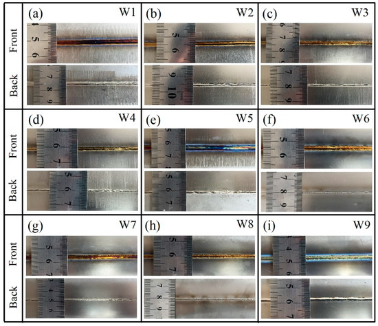 The front and back appearances of the laser-welded TC31 joints: (a–i) represent W1 to W9 samples.