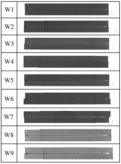 For further investigating the internal quality of the welds, the X-ray non-destructive testing was conducted and the result is shown in Figure 3. Except that porosity defects are observed in W8, other joints exhibit sound bonding without lack of fusion, slag or hot cracks.