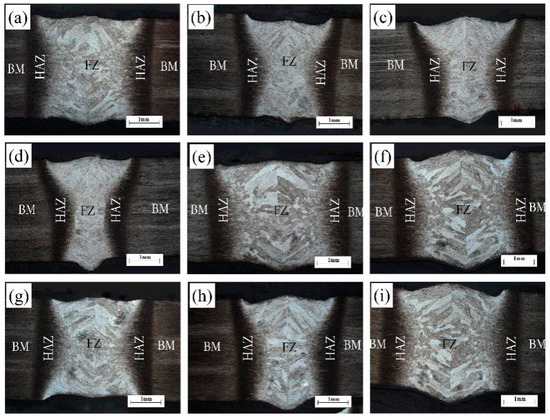 Optical micrographs of cross sections of as the laser-welded TC31 joints: (a–i) represent W1 to W9 samples.