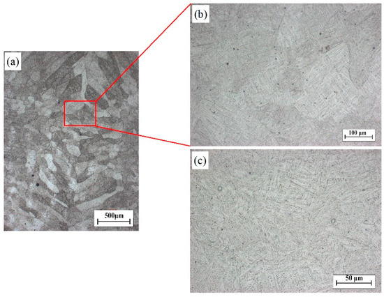 Figure 4 shows the optical micrographs of the cross-sections of W1 to W9 laser welded joints. The joints exhibit slight defect of undercut. The undercut with a maximum depth (≈0.165 mm) was occurred in W9 sample, and the undercut imperfection is 0.055t (t is the thickness of the alloy plate), which is lower than the limit of for quality C level (0.1t) according to ISO 5817 standard. Thus, the laser-welded TC31 joints reach the weld quality C level (medium quality requirements). In addition, no misalignment defect was observed in these joints. Three distinct regions in the joints can be observed, i.e., the fusion zone (FZ), the heat-affect zone (HAZ) and the base material (BM). The FZ mainly consists of coarse prior β columnar grains. There are a few equiaxed grains at the junction of the FZ and the HAZ. The columnar grains in the middle of cross section grow horizontally and towards the weld centerline, while the columnar grains closed to the weld front and back surfaces grow from the weld fusion line to the weld surface. Figure 5 shows the magnification view of the fusion zone and heat-affected zone of the W5 joint. It can be seen that there is a large amount of staggered needle-shaped α′ phases inside the columnar crystal, which is the typical structure of martensite [28].