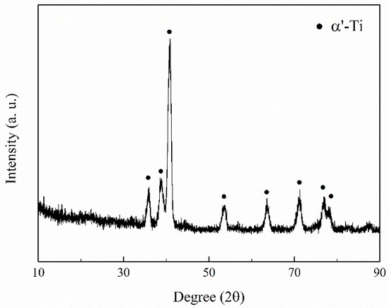 The phases in the FZ of the welded joints are examined by XRD. The examination is carried out on W2. As shown in Figure 6, the XRD pattern consists of the peaks corresponding to α′-Ti phase, and no peak corresponding to β-Ti phase is observed. This result implies that the major phase in the weld is α′-Ti phase. For further analyzing the microstructure of the joints, EPMA analysis is also conducted on the weld of W2. The backscattered electron image of the cross-section of the joint is shown in Figure 7. It is seen that the laser welded joint is free from obvious defects, such as voids and cracks. The BM consists of elongated α grain and intergranular β grain (Figure 7a). A large amount of acicular Ti and columnar prior β grain boundaries can be observed in the FZ as shown in Figure 7b,c, which implies that the prior β phase gradually transform into the secondary α phase [1,29].