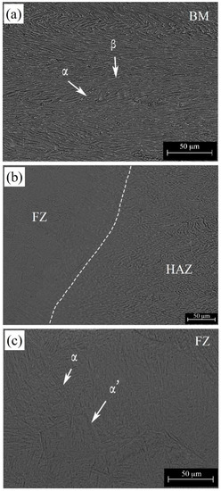 Backscattered electron images of the cross-section of W2 joint: (a) Base material (BM); (b) Heat-affect zone/Fusion zone (HAZ/FZ) transition zone; (c) Fusion zone (FZ).