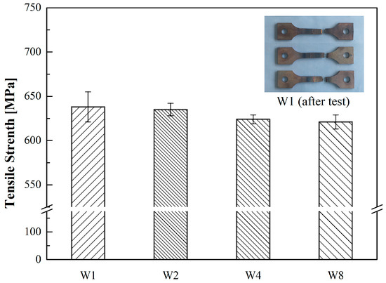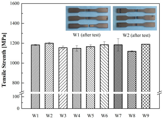 The tensile strength of the welded specimens at room temperature are listed in Figure 8, and the photographs of W1 and W2 joints after the tensile test are shown in the insets of Figure 8. It is observed that the average tensile strength of W2 reaches 1200 ± 10 MPa, which is equal to the tensile strength of TC31 alloy. Meanwhile, the average tensile strength of W1, W6, W7 and W9 samples also exhibit high tensile strength, reaching 1183 ± 4 MPa, 1185 ± 31 MPa, 1184 ± 63 MPa and 1190 ± 1 MPa, respectively. The fracture of two specimens of W1 joint occurred at the base material, while the ruptures of W2 specimens occurred in the HAZ. As seen in Figure 8, the W8 sample exhibits relatively low mechanical properties, which is caused by the porosity defects in the weld [31,32].