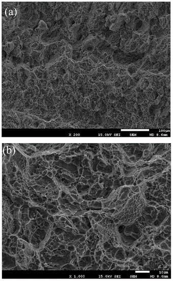 Fracture surface of W2 welded joint after tensile test performed at room temperature, (b) is the magnified view of (a).