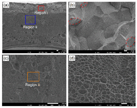 Fracture surface of W1 welded joint after tensile test performed at 923 K: (a) macroscopic appearance of fracture; (b) high magnification magnification of Region i; (c) high magnification magnification of Region ii; (d) high magnification magnification of Region iii.