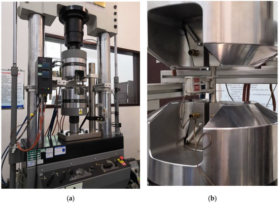 (a) Electro-hydraulic servo universal testing machine MTS-370-250KN; (b) specimen in the machine.