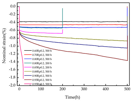 The nominal strain vs time curves of TA31 alloy under different compressive stress levels are shown in Figure 4, from which the variations of nominal strain with time can be directly obtained. The slope at any point of the curve represents the strain rate at the point. As can be seen from Figure 4, under the compression stresses of 0.60Rp0.2, 0.70Rp0.2, and 0.80Rp0.2, the nominal strain increases rapidly to 0.38%, 0.46%, and 0.54% respectively in the initial stage of loading, and then the strain is experimental time independent, and no obvious creep strain is observed, which means there is no creep under the compression stresses of 0.60Rp0.2, 0.70Rp0.2, and 0.80Rp0.2.