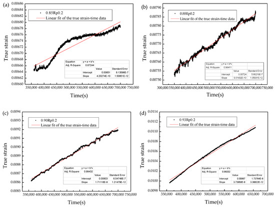 Linear fit of the true strain–time curve of TA31 alloy in the steady creep stage under compressive stresses of (a) 0.85Rp0.2; (b) 0.88Rp0.2; (c) 0.90Rp0.2; (d) 0.93Rp0.2.