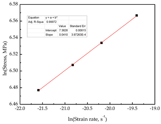The values of n and K can be derived from the slope and intercept of the linear fitting line of ln (σ) vs. as shown in Figure 7. The values of n and K in the present study are −179.71 and 24.41, respectively.