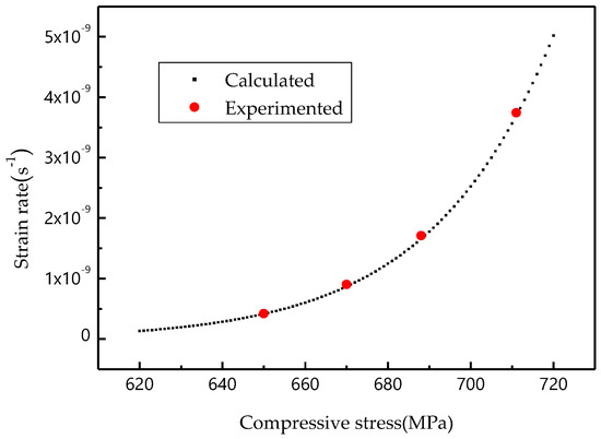 On account of the creep model, the creep rate of TA31 titanium alloy in the steady-state creep stage under different compressive stress levels can be calculated. Figure 8 and Table 4 illustrate a comparison of the calculated with the experimental strain rate of TA31 titanium alloy. The mean difference between the calculated with the experimental strain rate of TA31 titanium alloy is 2.54%, suggesting the effectiveness and reliability of the creep model in predicting the creep behavior of TA31 alloy.