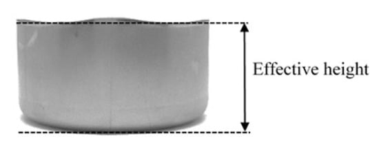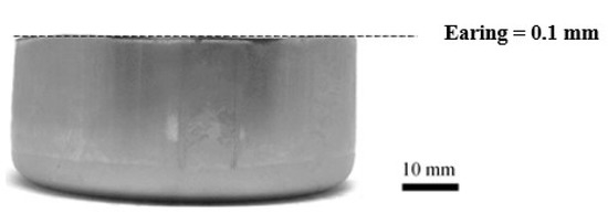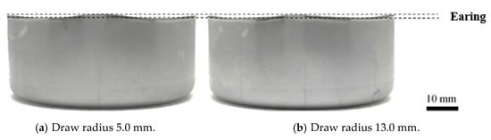 The same manner of strain distribution analysis in the cases of a draw radius of 5.0 and 13.0 mm could be observed. In terms of thickness strain distribution, it was negative in all directions in the sheet plane. The large negative thickness strain was generated in the direction along the plane and at 90° to the rolling direction, and the small negative one was generated in the direction at 45° to the rolling direction. In comparison to the middle cup wall zone, at the near edge of the cup wall, the positive thickness strain was generated instead of the negative one. Again, the large thickness strain was still generated in the direction at 45° to the rolling direction. Therefore, the material thinning was formed at the middle of cup wall, whereas the material thickening was formed at the near edge of the cup wall. To validate these results, the thickness examinations were carried out, and the thickness distributions are shown in Figure 7. There was a small change of material thickness on the cup bottom zone due to the stretching flange deformation characteristic. However, the maximum material thinning was generated on the cup bottom radius because the bending was added to the stretching flange deformation characteristics, and then the large plastic deformation was generated in that area. It was also observed that the changes in material thickness with respect to draw radii were somewhat at the same level. The effects of the rolling direction on the material thickness of the cup bottom zone and cup bottom radius zone were very small. With the cup wall zone, the results showed that the material thinning was decreased along the cup wall height. The effects of the rolling direction on material thickness were clearly illustrated, especially on the cup wall zone. These thickness distribution results agreed well with the thickness strain distribution results calculated on the basis of the deformed grain size. These results also corresponded well with the deep drawing theory and literature [18,19]. Next, in terms of radial strain and circular strain distributions, the radial strain was positive, but the circular strain was negative. The large radial strain was generated in the direction along the plane and at 90° to the rolling direction, and the small one was generated in the direction at 45° to the rolling direction. Again, the large circular strain was generated in the direction along the plane and at 90° to the rolling direction, and the small one was generated in the direction at 45° to the rolling direction. These results could be explained that, owing to the R-value as listed in Table 2, the plastic deformation would occur earlier in the direction along the plane and at 90° to the rolling direction due to the large R-value. Therefore, the material would flow into these directions from other portions, i.e., the portion at 45° to the rolling direction. Therefore, the nonconcurrent plastic deformation was generated and then caused the restriction of material flown into the die. In addition, the highly excessive elongating material flowed outward in the direction to edge of the blank sheet. Therefore, the earing defects were formed by the peak of the earing profile that was along the plane and at 90° to the rolling direction, whereas the bottom of the earing profile was at 45° to the rolling direction. Figure 8a,b show the earing defects in the case of a draw radius of 5.0 and 13.0 mm, respectively. The obtained earing defects were approximately of 1.7 mm in both cases of the draw radius of 5.0 and 13.0 mm. It was also observed that the peak of the earing profile formed along the plane and at 90° to the rolling direction, whereas the bottom of the earing profile formed at 45° to the rolling direction. They agreed well with radial and circular strain distributions calculated on the basis of the deformed grain size. These results also corresponded well with the deep drawing theory and literature [18,19]. As a result, based on the microstructure evolutions and strain distributions, the occurrence of earing defects could be clearly clarified. These data are valuable information for supporting MDR die design and development to achieve the nearly zero earing defects.