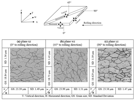 Microstructure examinations of SPCC steel (JIS): (a) plane xz (0° to rolling direction); (b) plane wz (at 45° to rolling direction); (c) plane yz (at 90° to rolling direction).