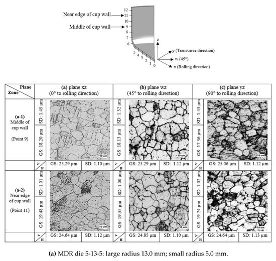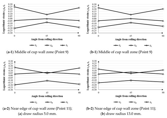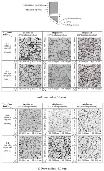 As per the deep drawing theory [19], the cylindrical cup is initially formed after the blank is drawn over the draw radius. This characteristic resulted in the microstructure evolutions and generated strain distributions on the cup. Specifically, the crystal grain deformed adjusting to macroscopic deformation, and so the deformation of crystal grain would naturally correspond to macroscopic strain. On the basis of the fundamentals of the deep drawing mechanism, the material at the cup bottom zone was subjected to equi-biaxial tension and the stretching flange deformation was generated based on the equi-biaxial elongation. This deformation characteristic commonly results in the material thinning. The stretching flange characteristic also commonly formed at the cup bottom radius zone. The bending characteristic was formed at this zone, in addition. Therefore, in general, the material thinning was greatest, and the possibility of breakage was also the highest at the cup bottom radius zone. Next, to form a cup wall, the material at flange portion moves in the direction to the center of die, and then this material must shrink in circular direction. As these characteristics, the tension and compression stresses are commonly generated in radial and circular directions, respectively. Therefore, the material elongates and shrinks in radial and circular directions, respectively. Based on these characteristics, after the cup wall completely formed, the earing defects were simultaneously generated. Therefore, relating to the R-value, the analysis of the microstructure evolutions and strain distributions on the cup wall zone was focused on in the present research to clarify the earing defects as well as to use as fundamental information for a new die design to prevent earing defects. In comparison to the initial blank sheet, the microstructure evolutions along the plane at 45 and 90° to the rolling direction at the middle and near edge of the cup walls in the case of a draw radius of 5.0 and 13.0 mm are shown in Figure 5. The examined elongated grains in the horizontal and vertical directions were reported as well. Based on these examined grain sizes, the logarithmic strain in each direction was calculated based on Equation (1). Therefore, by the same token, the logarithmic strains in radial and thickness directions could be calculated as well. Next, by using the volume constancy law, the logarithmic strain in the circular direction could be calculated following Equation (2), and they were reported in the Figure 6.