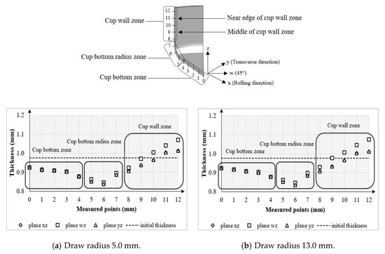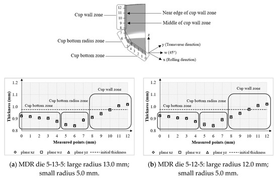 Illustration of thickness distributions on deep drawn parts with respect to MDR dies: (a) MDR die 5-13-5; (b) MDR die 5-12-5.