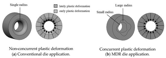 Illustration of plastic deformation characteristics with respect to die types: (a) conventional die application; (b) MDR die application.