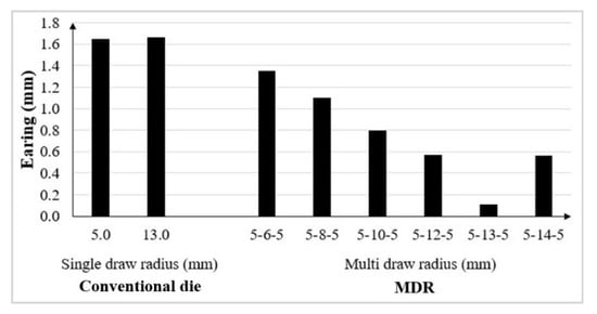 As per the author past research [18], the multi draw radius (MDR) deep drawing die is mainly proposed to increase the limiting drawing ratio of cylindrical deep drawn parts (LDR) by reducing the nonaxisymmetric material flow during deep drawing process. In the present research, this MDR die was proposed and applied to prevent the earing defects. Figure 9 shows the conceptual design of the MDR die. By using the conventional die, as shown in Figure 9a, the nonconcurrent plastic deformation characteristic was formed during the deep drawing process because of the effects of the R-value. As aforementioned, the plastic deformation would occur more early in the direction along the plane and at 90° to the rolling direction due to the large R-value. This resulted in the restriction of material flown into the die due to the highly excessive elongating material flow into these directions from other portions. Then, the nonaxisymmetric material flow characteristic on the flange portion during the deep drawing process was generated [18]. These plastic deformation and material flow characteristics caused the material in the direction along the plane and at 90° to the rolling direction were easier to stretch compared to that in direction at 45° to the rolling direction, and then, the earing defects were formed. To encounter these characteristics and prevent earing defects, the later plastic deformation generated in the direction at 45° to the rolling direction should be driven to generate earlier as it generated in the direction along the plane and at 90° to the rolling direction. Therefore, the plastic deformation in different directions in the sheet plane during the deep drawing process could be concurrently generated. As per the past research [18], by using the MDR die, the axisymmetric material flow characteristic could be achieved. Therefore, the MDR die might be able to solve the above-mentioned plastic deformation characteristic and earing defects. As suggested in the past research, the larger draw radius was positioned at 45° to the rolling direction and the smaller draw radius positioned along the plane and at 90° to the rolling direction. This resulted in the plastic deformation generating in the direction at 45° to the rolling direction, which could be made to occur earlier, and then the concurrent plastic deformation characteristic could be controlled, as shown in Figure 9b. The uniform material stretching in each direction in the sheet plane could be generated, and the uniform strain distribution in each direction in the sheet plane could be obtained. Concerning these plastic deformation mechanisms, by using the MDR die, the achievement of nearly zero earing defects by the process encountering the material mechanical property of the anisotropy property of the material could be met. However, the draw radius in each direction in the sheet plane should be positioned as follows: the larger draw radius positioned at 45° to the rolling direction and the smaller draw radius positioned along the plane and at 90° to the rolling direction. In the present research, the different MDR dies were investigated to achieve nearly zero earing defects, and the results are shown in Figure 10. Specifically, the small draw radius of 5.0 mm, as recommended for conventional deep drawing die, was positioned along the plane and at 90° to the rolling direction. The large draw radius of 6.0–14.0 mm was positioned at 45° to the rolling direction. The results showed the decreases, and again, the increases in the earing defects as the large draw radius increased. The smallest earing defects approximately of 0.1 mm could be generated with the large draw radius of 13.0 mm applied.