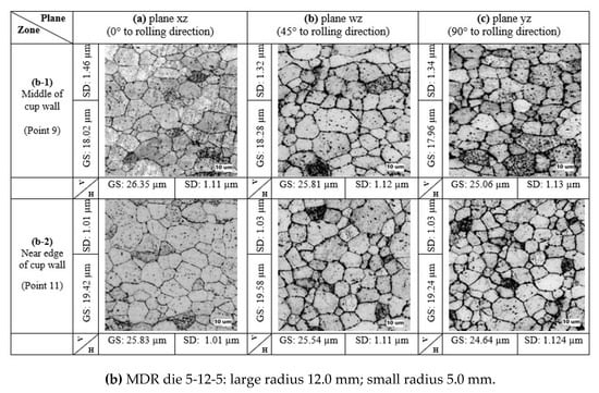 Comparison of microstructure evolutions on deep drawn parts with respect to MDR dies: (a) MDR die 5-13-5; (b) MDR die 5-12-5.