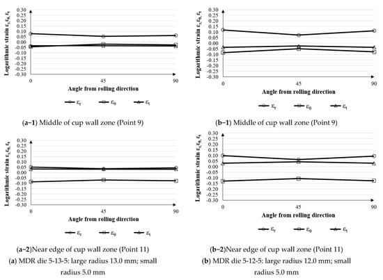 Comparison of strain distributions on cup wall zone with respect to MDR dies: (a) MDR die 5-13-5; (b) MDR die 5-12-5.