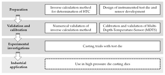 In order to achieve the overall goal of a valid determination of the heat transfer coefficient, the necessary work was divided into individual research tasks. In this context, Figure 1 shows the approach and the individual tasks performed. In the first stage (preparation), a suitable method for estimating the HTC, the nonlinear sequential function method, was qualified and the influence of different possible signal qualities on the result of the reconstruction was investigated. Furthermore, the design and production of multi-depth temperature sensors was carried out. These sensors should have low manufacturing costs and dimensions with sufficient temporal and spatial resolution of the temperatures to be measured and thus offer the potential for extensive use in casting dies. Furthermore, in the first stage a test tool was designed and manufactured, which allows the integration and the use of the developed sensor technology for initial testing purposes. In the second phase, the chosen method for inverse calculation of the HTC was validated using a numerical model where the HTC was known in advance. Furthermore, the suitability, as well as the accuracy of the manufactured temperature sensor, was validated by experiments at an electron beam machine. For this purpose, the surface of the multi-depth temperature sensor was heated by means of an electron beam and the surface temperature was measured with a pyrometer. By evaluating the synchronized measuring signals of the multi-depth temperature sensor and the pyrometer, the exact position of the individual measuring points could be determined using a finite element calculation. The third phase, which is presented in this publication, involves carrying out experiments with a test tool. The aim here was to obtain and evaluate measurement results using a real cast material and associated boundary conditions, such as maximum temperature, temperature gradients and shrinkage. A future step, which is a continuation of the present work and is not presented in the context of this publication, is the use in the context of an instrumented, industrial die casting die and the determination of corresponding component properties.