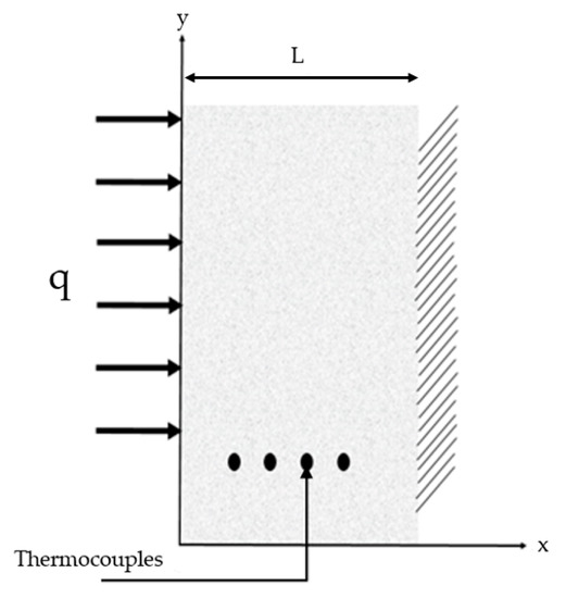 In some processes, such as die casting, where heat conduction problems occur, it is difficult to directly quantify the initial amount of heat flow at the exchange surface. This refers to the fact that the instrumentation at the die-casting surface is difficult to implement. However, it has been proven that from measurement points beyond the surface and within the heated body, the temperature profile can be recorded and later an inverse technique can be used to estimate the initial heat flow at the surface and the initial temperature [16]. The direct heat conduction problem in the 1-dimensional domain for a transient heat flow within a semi-finite body of length L is modeled in Figure 2 and expressed by the diffusion Equation (1a) and the different boundary conditions (1b–e).